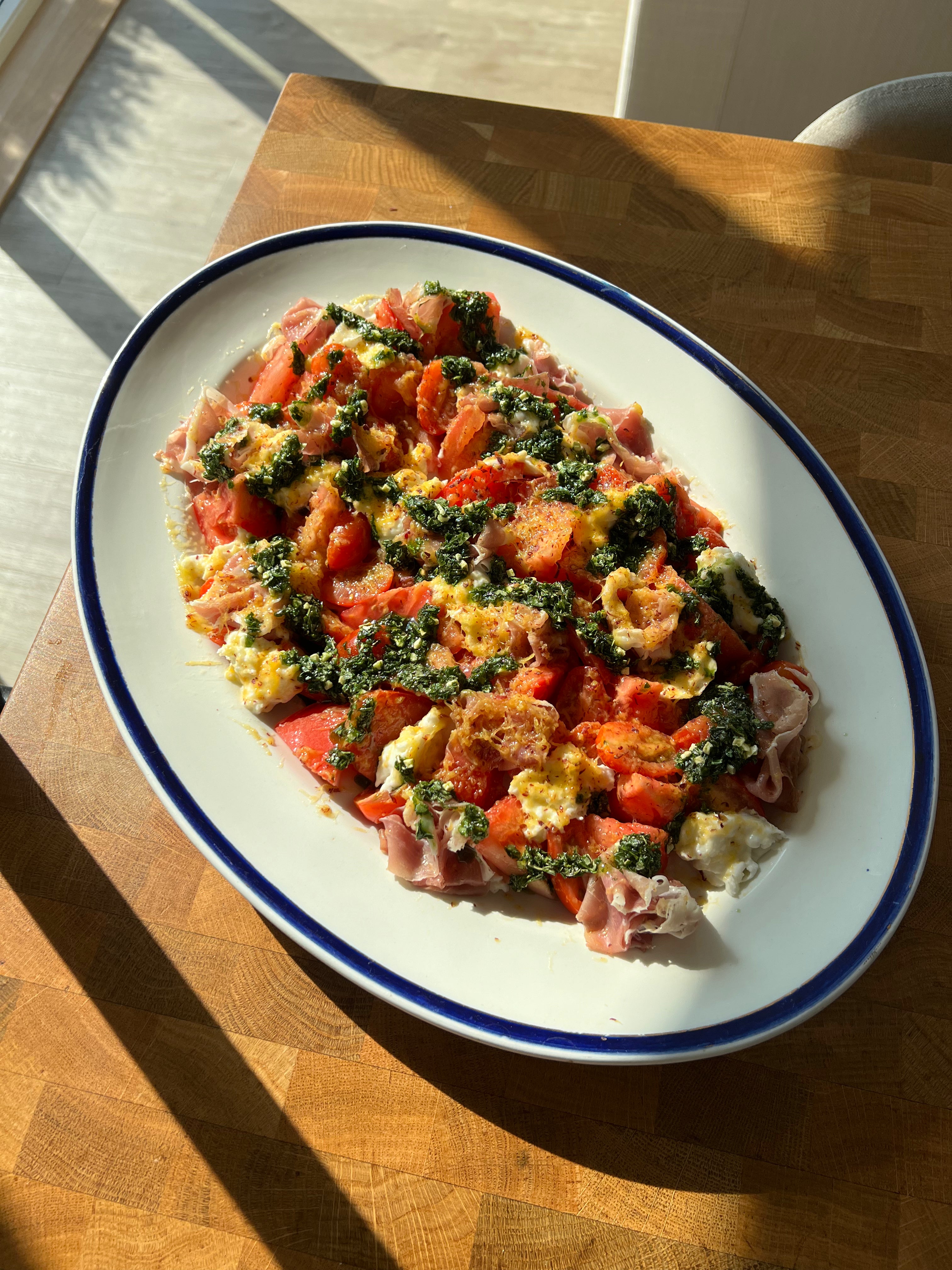 Assemble the salad – Roughly chop your fresh tomatoes and arrange them on a plate. Add torn pieces of mozzarella and slices of prosciutto. Season with salt to taste.