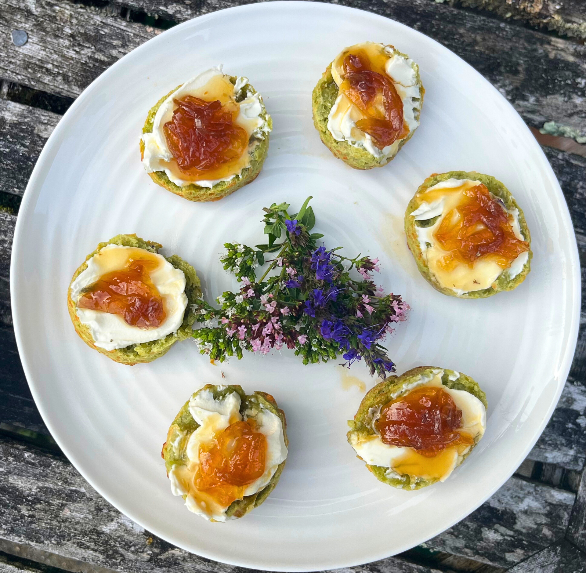 - Once cool, split the scones and spread with onion chutney and add a dollop of Philadelphia.