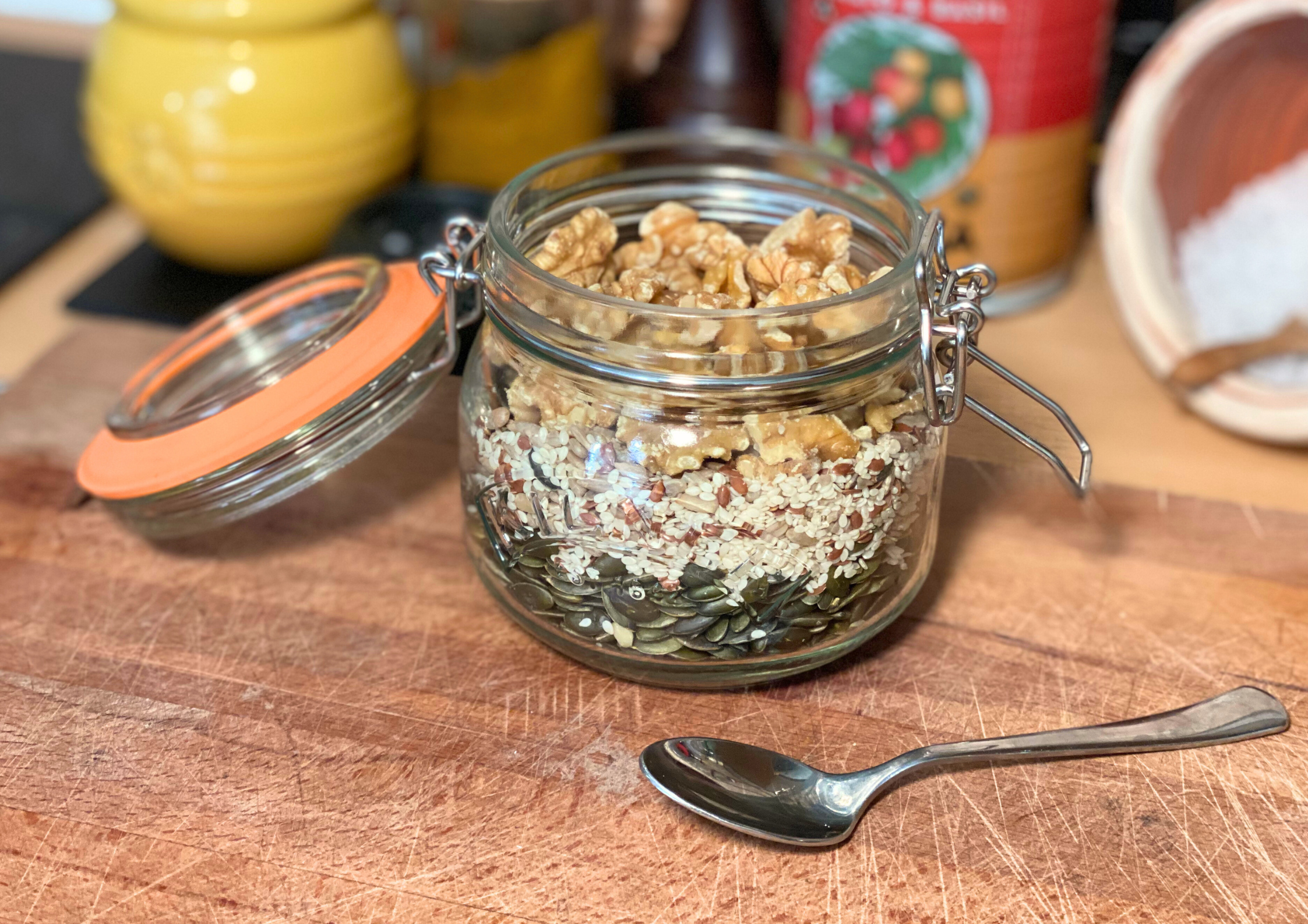 We love the gut-health tips Tim Spector shares. To help maximise diversity in the gut, Tim and other scientists suggests eating 30 different plants a week. A ready-to-go seed and nut jar is one hack he shares on how to achieve this goal.