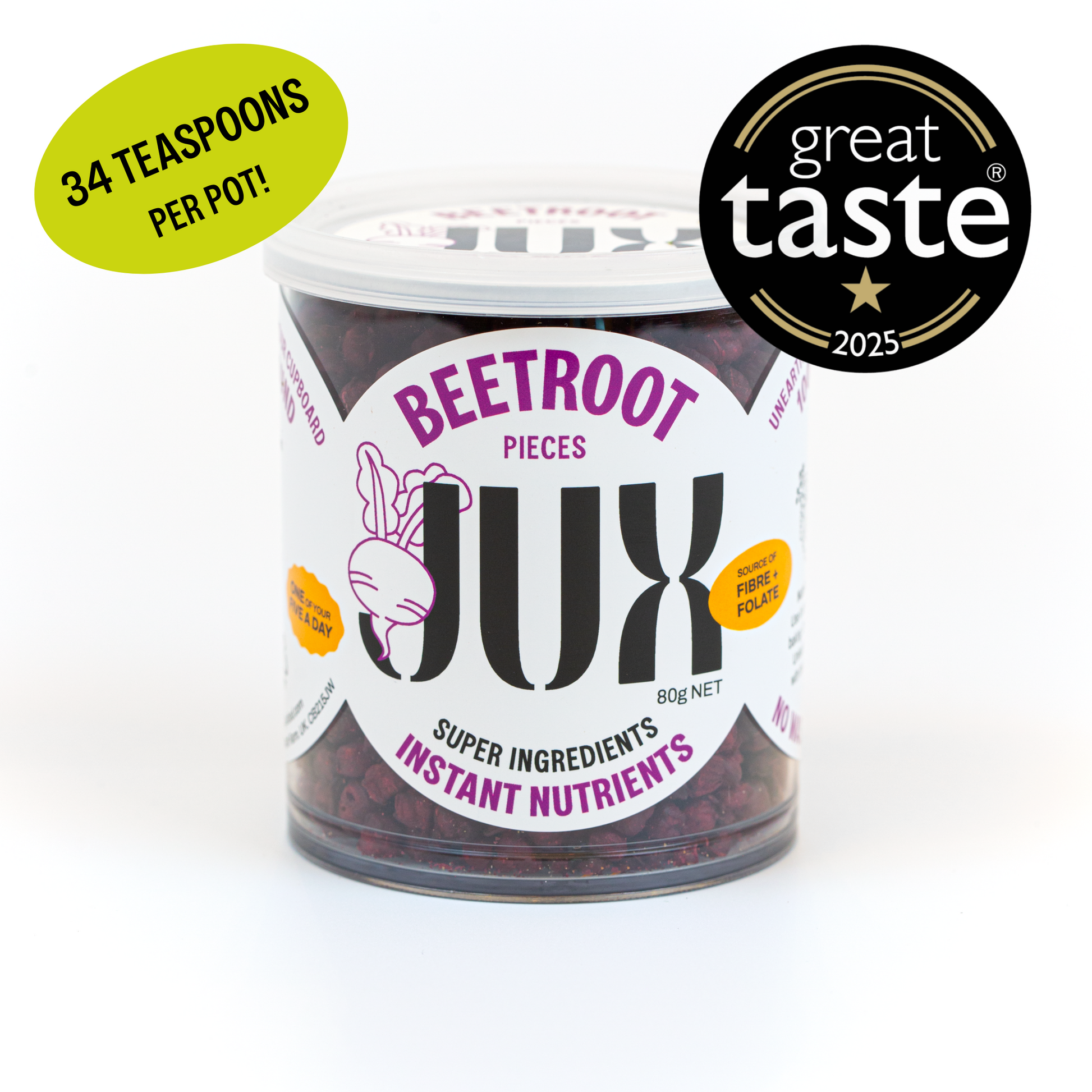 AS SEEN ON THE JAMES MARTIN SATURDAY SHOW! Each 80g pot contains 34 teaspoons of fresh beetroot! Add to soups, salads and sauces – or enjoy straight from the pot! JUX Beetroot Pieces are your shortcut to earthy, sweet flavour & vibrant colour – no peeling, no boiling and no purple fingers. Freeze-dried & diced to preserve nutrients and deep purple hue, these diced Beetroot pieces can be used as a salad topper straight from the pot, or tossed into your favourite dishes to boost flavour and plant intake without any prep or waste. We recommend using JUX as a straight swap for fresh beetroot in all your favourite dishes. Stir straight into cooking or rehydrate in water first for a softer, juicy texture.